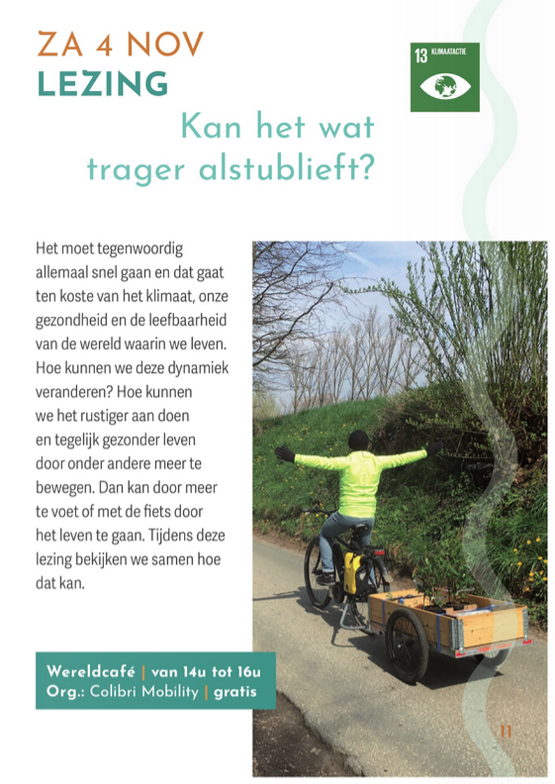 Tijdens deze lezing nodigen we je uit om samen na te denken over alternatieve, duurzamere vervoersmodi, waaronder de fiets en te voet gaan. Hoe kunnen we deze een prominente plaats geven in de manier waarop we bewegen. We inspireren ons op literatuur van experten ter zake, zoals (de andere) Kris Peeters (expert mobiliteit), 'fietsprofessor' Marco te Brömmelstoet en Ing. Philippe Bihouix (expert Lowtech).